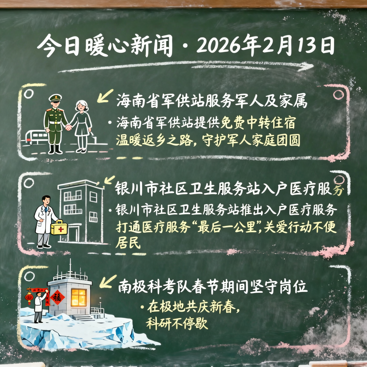 军地合力保障官兵和军属团圆之路——身后有家国 归途有温暖 春运期间,海南省军供大厦迎来了4名军属。军供站工作人… 继续阅读今日暖心新闻 – 2026年2月13日