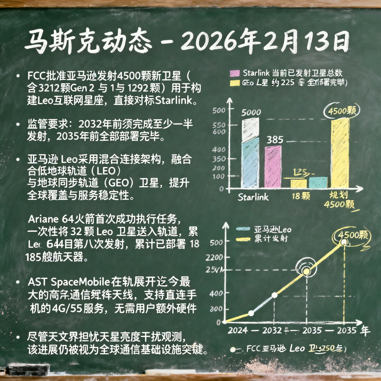 FCC批准亚马逊Leo发射4500颗新卫星,与Starlink竞争 美国联邦通信委员会(FCC)已批准亚马逊L… 继续阅读马斯克动态 – 2026年2月13日